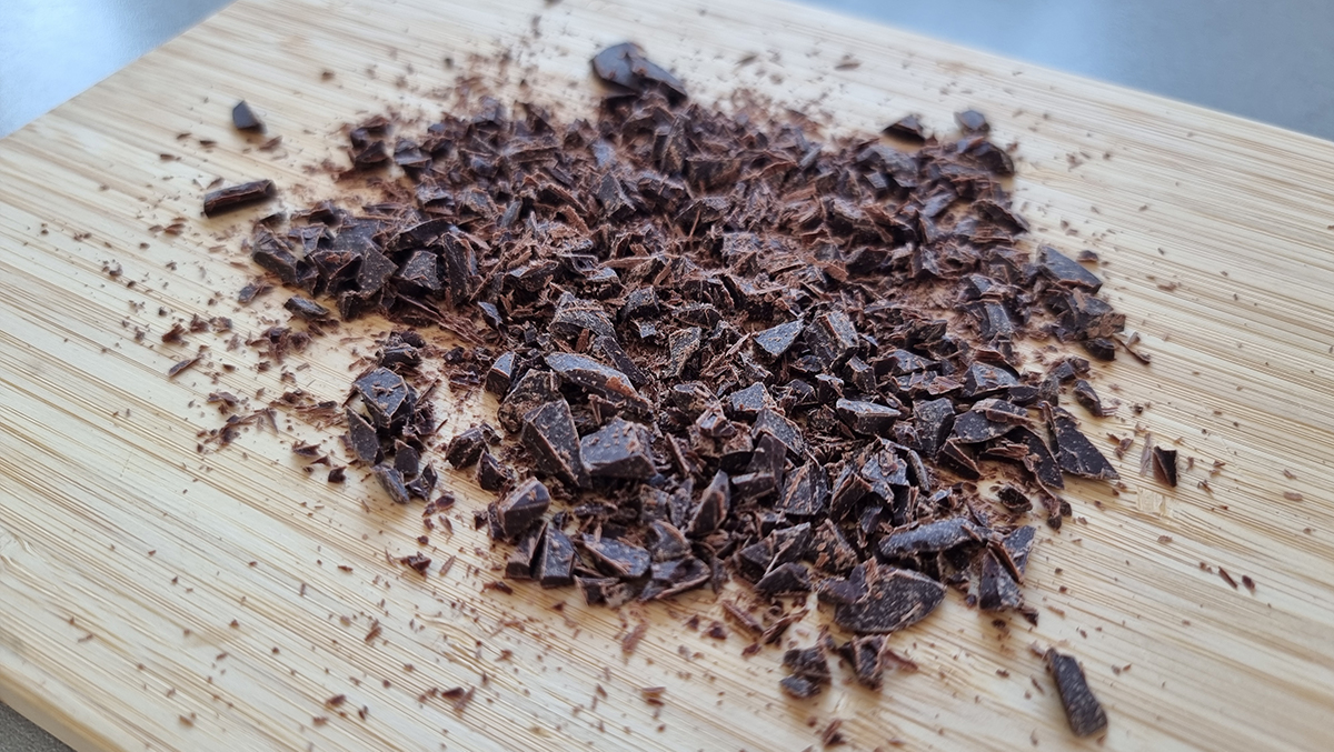 Hakkede (melkefrie) sjokoladebiter smaker nydelig i bananlappene.